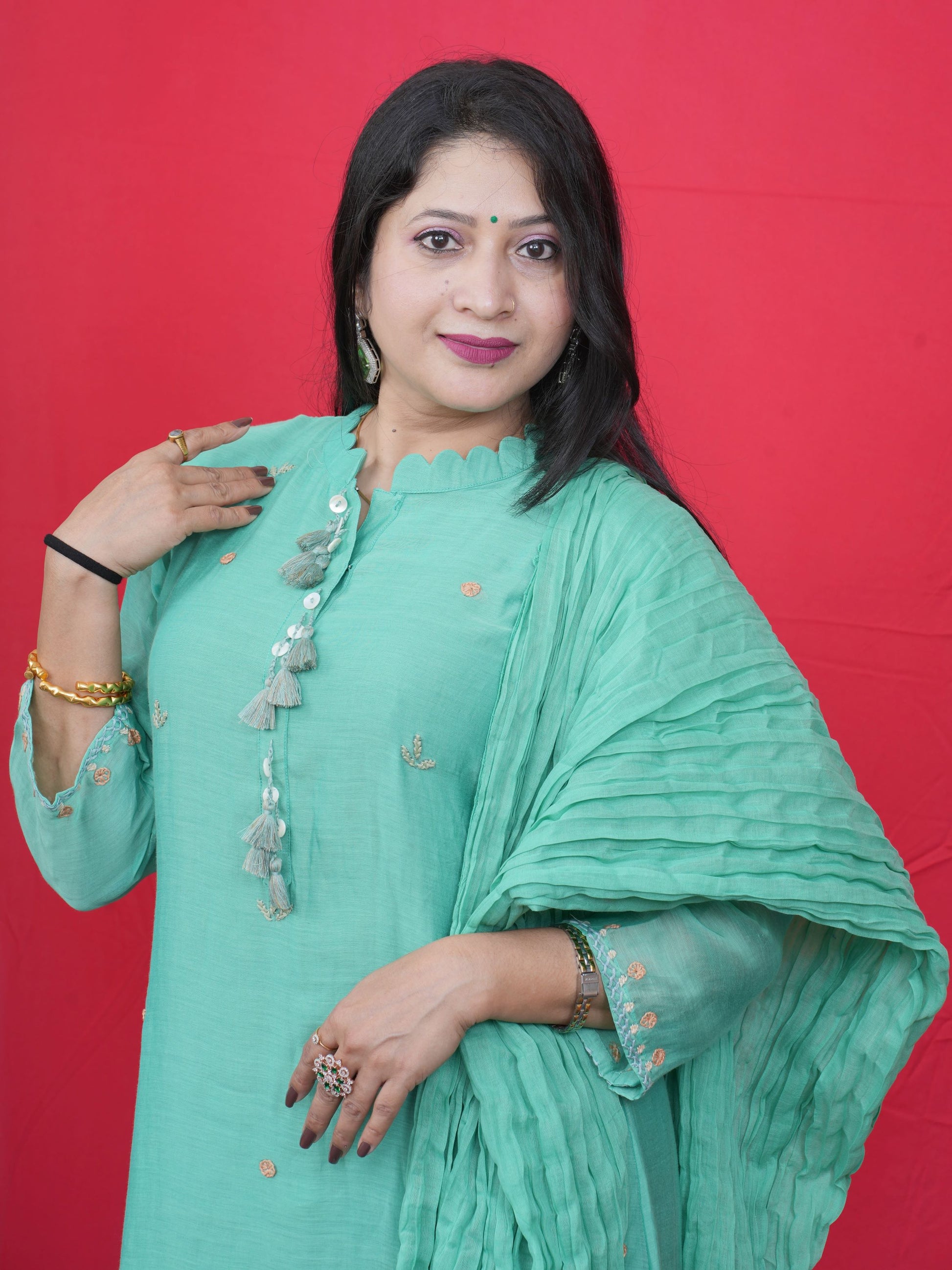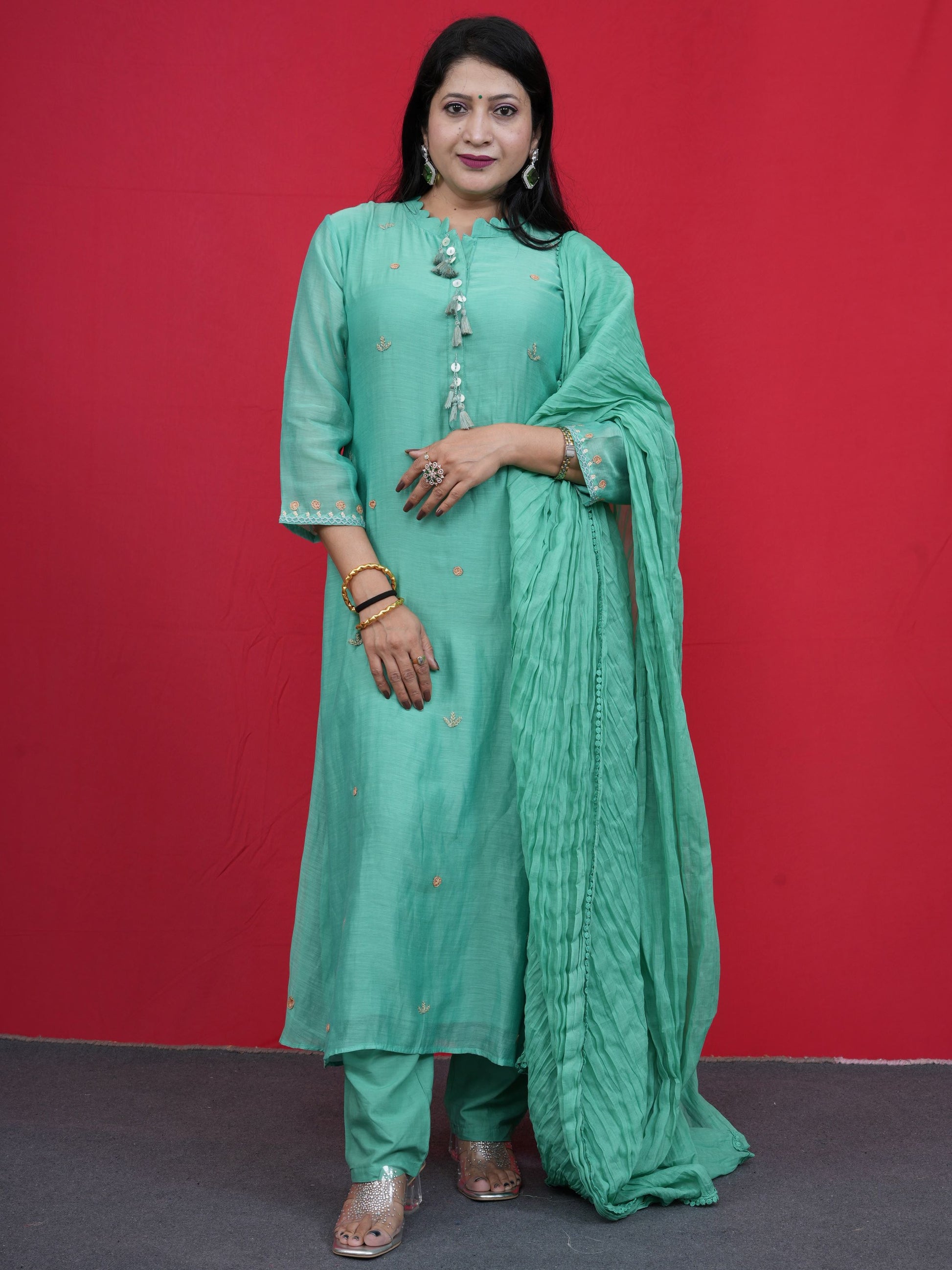 Add timeless elegance to your ethnic wardrobe with this mint green kurta set, delicately adorned with mirror work and golden thread embroidery. The highlight of this outfit lies in its exquisitely embroidered back panel, showcasing intricate patterns in soft pastels and gold. The front features a minimal design with mirror tassels and delicate buti work, paired with matching pants and a pleated dupatta.