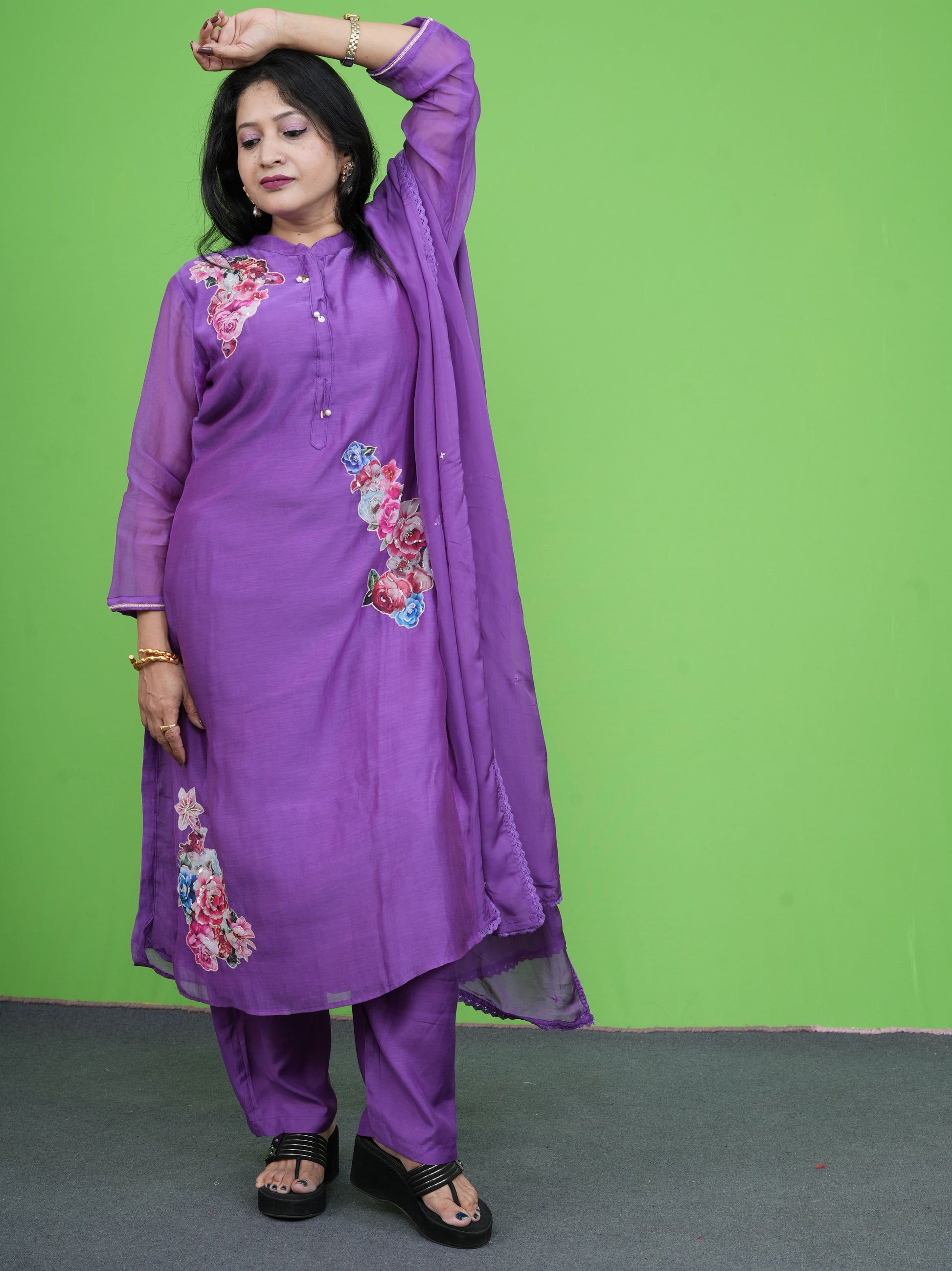 Elevate your everyday ethnic look with the bold charm of the Gulnaar Violet Floral Set. Crafted in a rich purple hue, this straight-cut kurta features vibrant floral appliqué embroidery in multicolor tones, adding a fresh pop of detail and femininity to the silhouette.