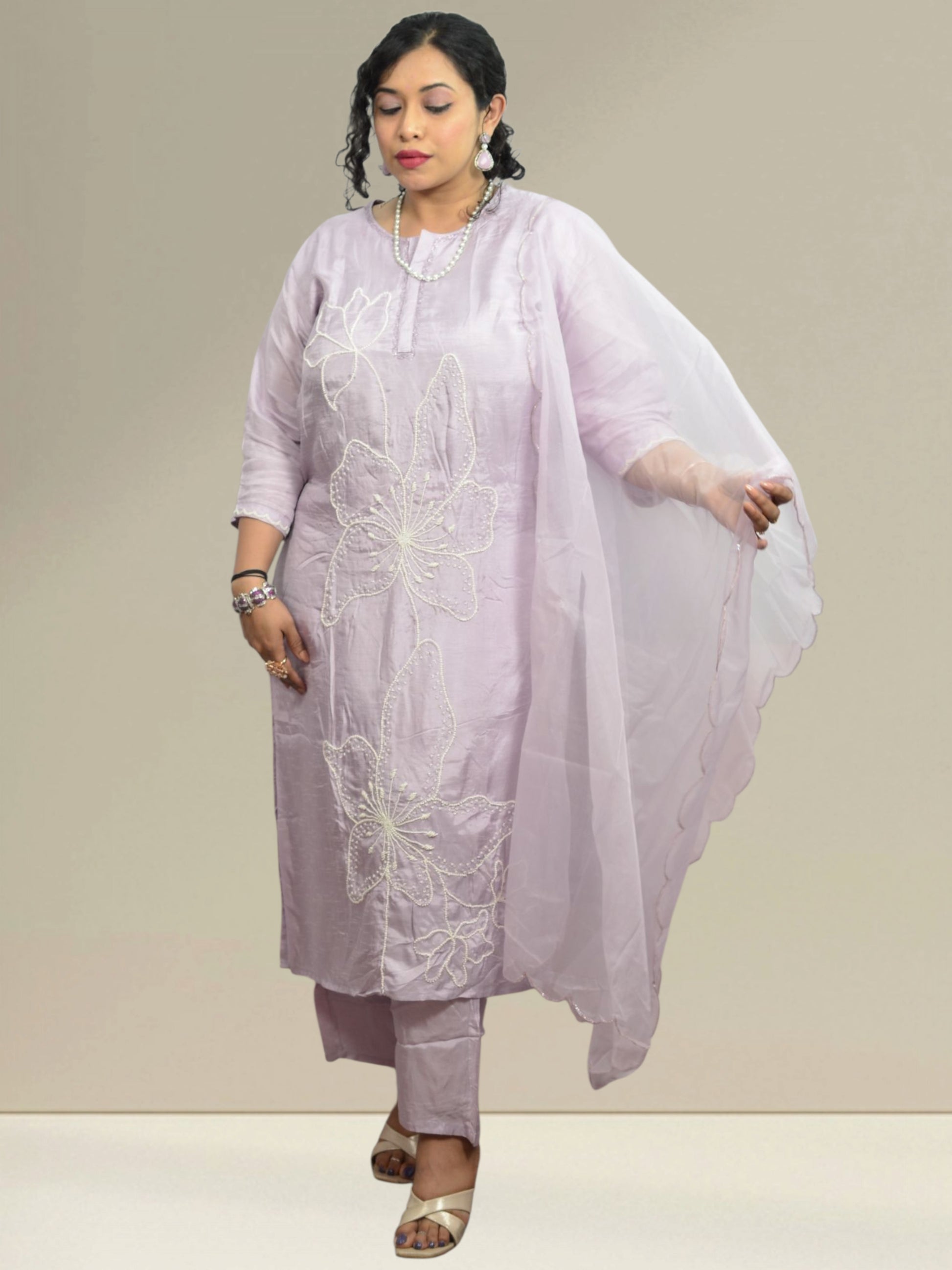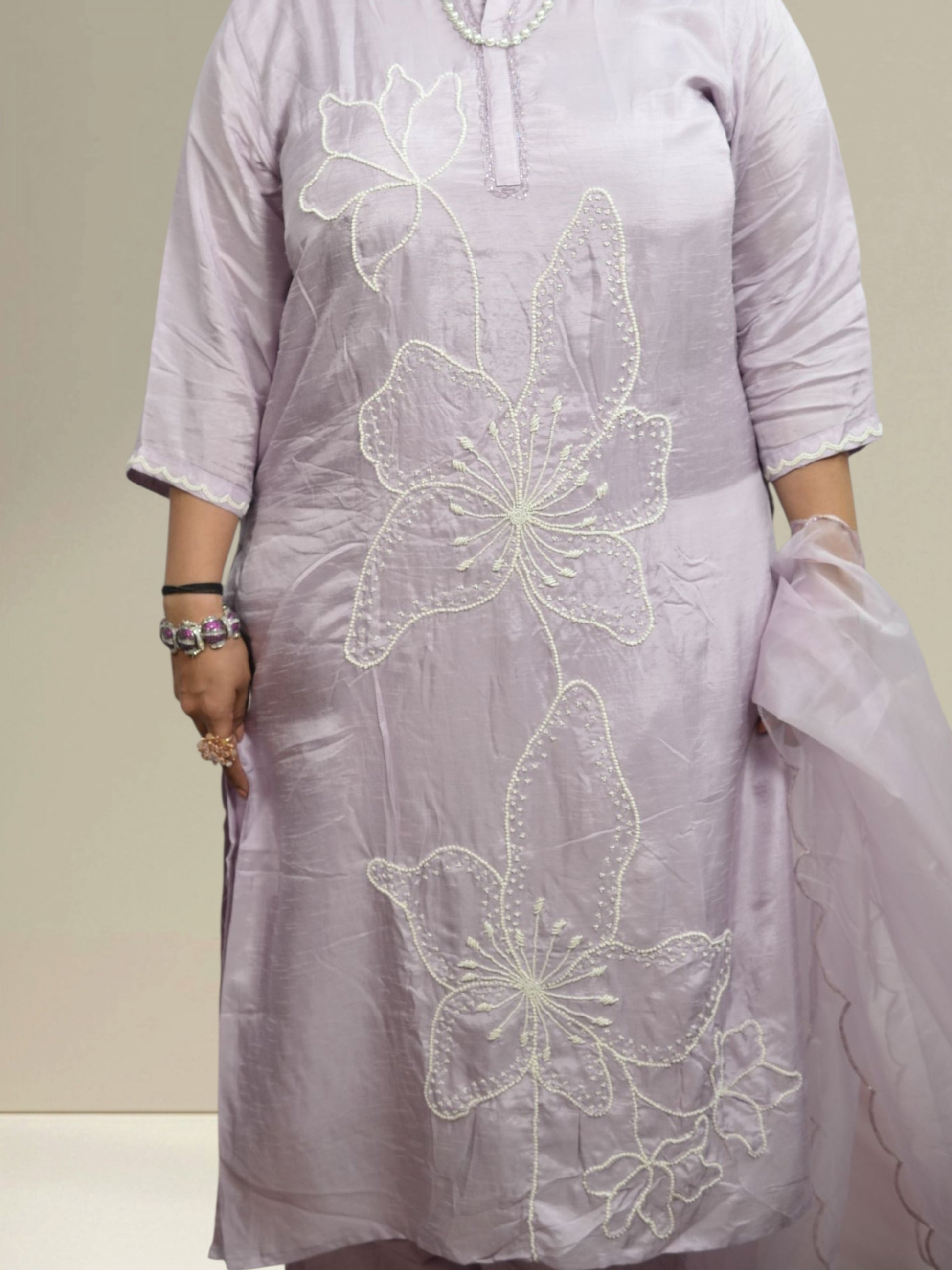 Step into elegance with our Lilac Whisper Embroidered Kurta Set, a delicate blend of charm and comfort. Crafted from lustrous Silk fabric in a soft lavender hue, this ensemble features intricate white floral embroidery that exudes femininity and grace. The matching straight-cut pants and a scallop-edged chiffon dupatta elevate the outfit with a breezy, ethereal finish.