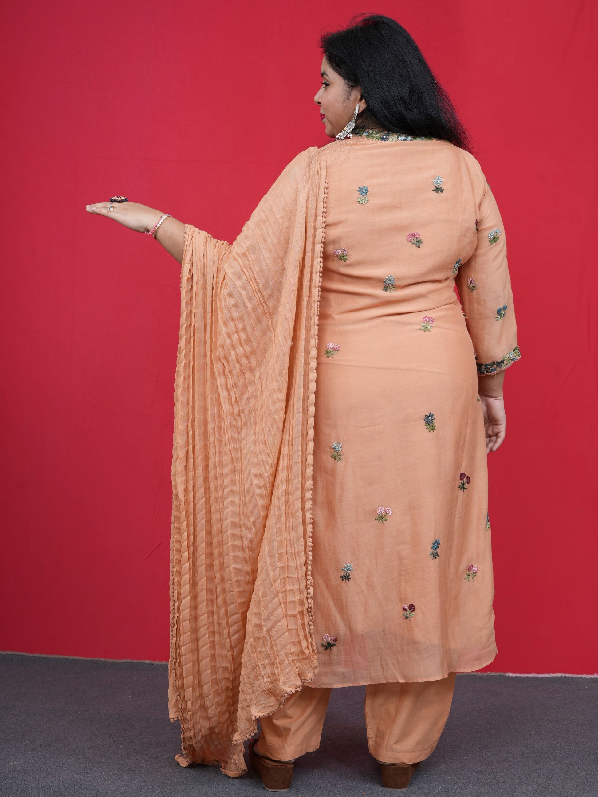 Radiate effortless grace in this charming peach orange kurta set, crafted with subtle elegance for all-day comfort and style. The kurta features delicate floral embroidery in soft multicolored threads, scattered across the fabric, with detailed embellishments along the neckline and cuffs. Paired with matching straight pants and a crinkled dupatta.