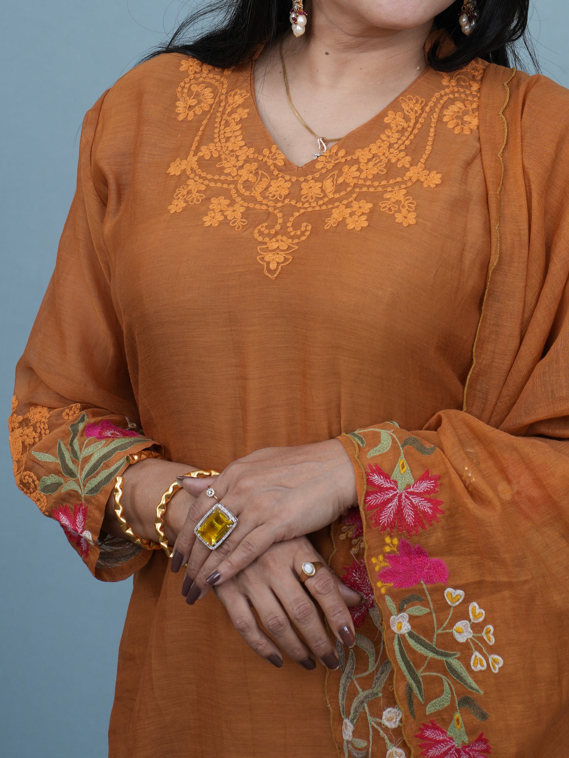Radiate festive warmth with this elegant mustard yellow suit set crafted in a soft silk blend. The kurta features subtle embroidery around the neckline and floral threadwork on the sleeves, blending simplicity with timeless charm.