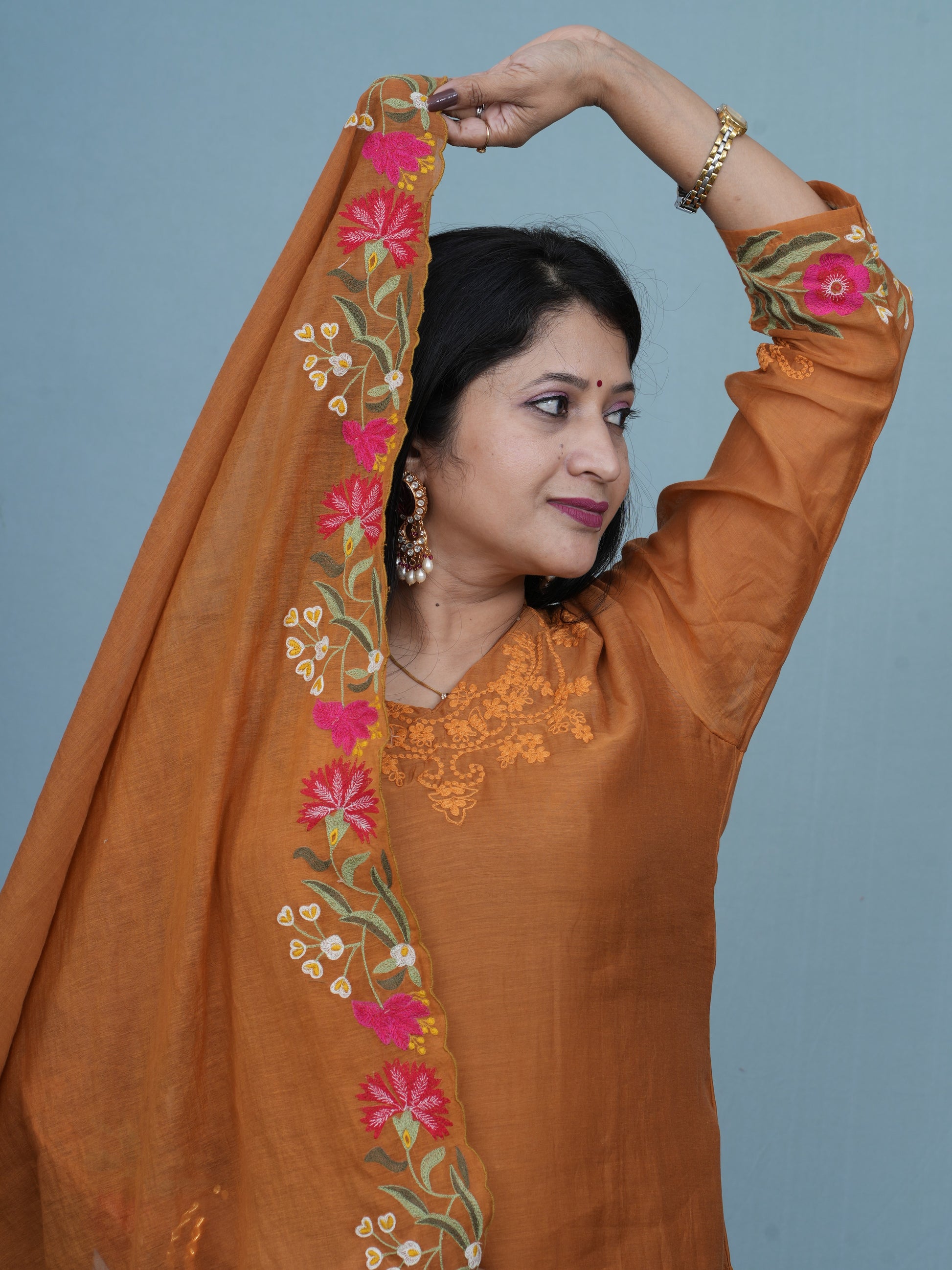 Paired with matching pants and a beautifully embroidered dupatta adorned with floral motifs and tassel detailing, this outfit is perfect for festive gatherings, family occasions, or casual ethnic outings. The rich mustard hue adds a regal touch, making it a versatile choice for day or evening wear.
