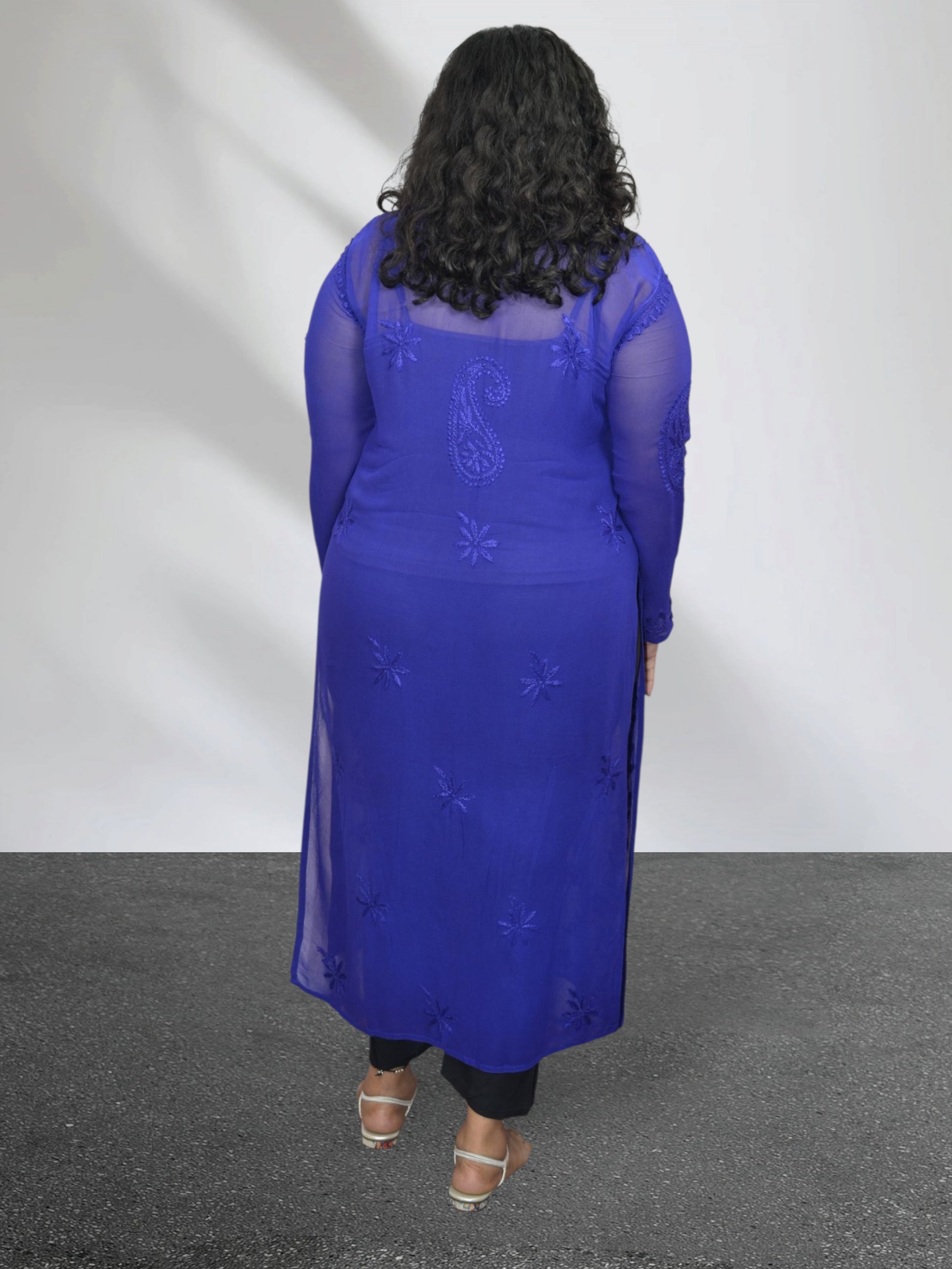 Make an elegant statement in this stunning Royal Blue Embroidered Kurta Set, a perfect blend of traditional craftsmanship and graceful charm. Crafted in sheer, lightweight fabric with a soft lining, this kurta features intricate tonal Chikankari embroidery, adding texture and depth without overwhelming the design. The straight silhouette, side slits, and full sleeves offer a flattering fit that flows beautifully on all body types.