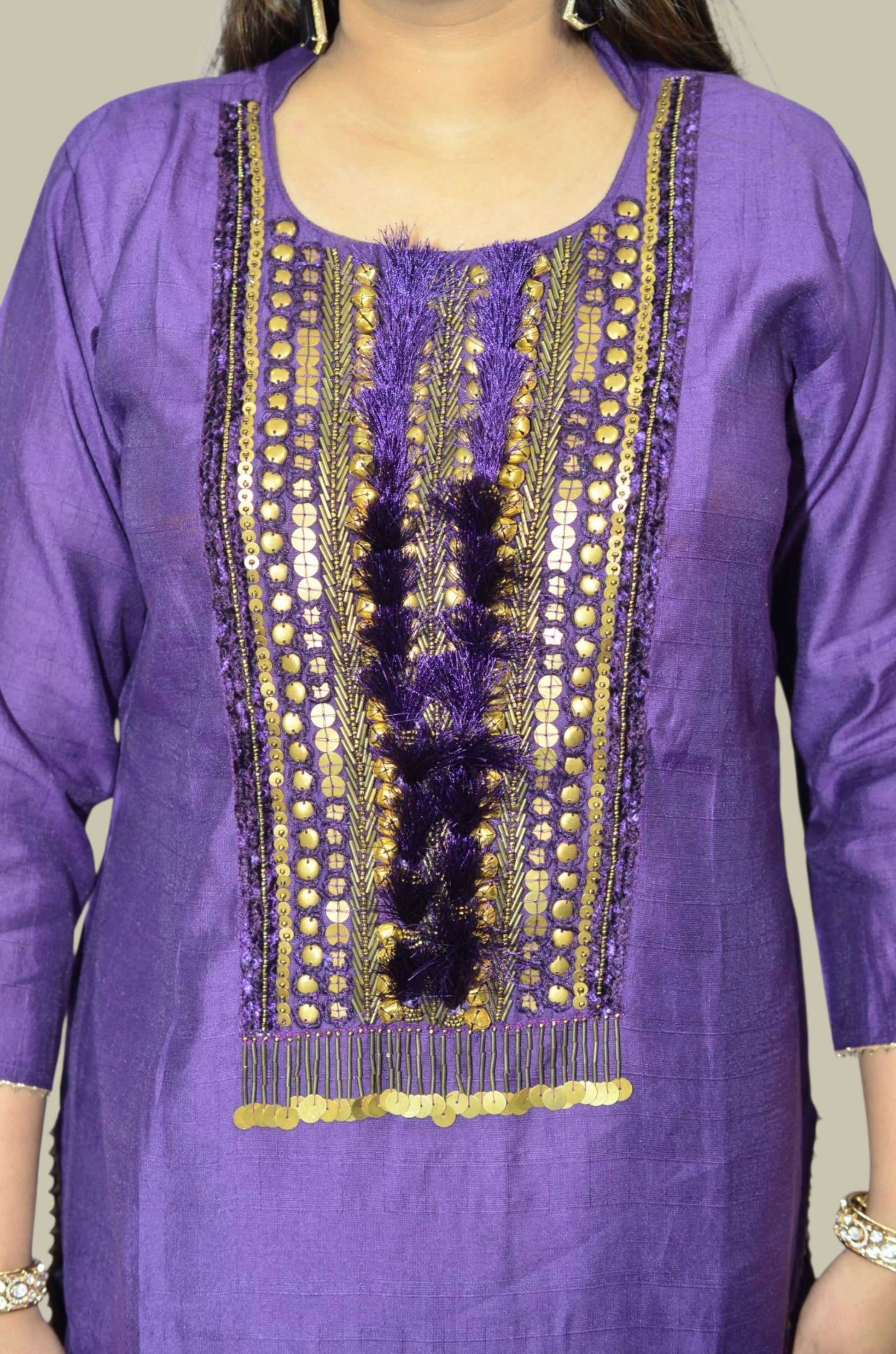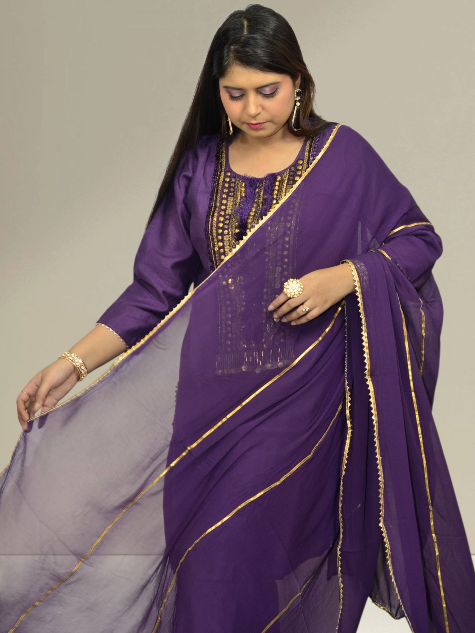 Step into the spotlight with our Royal Purple Kurta Set, a regal blend of rich color and traditional charm. Crafted in a deep royal purple hue, this set features a straight-cut kurta adorned with intricate mirror and thread embroidery down the front panel. The embellishments shimmer with every move, making this outfit a perfect choice for festive evenings or celebratory occasions.