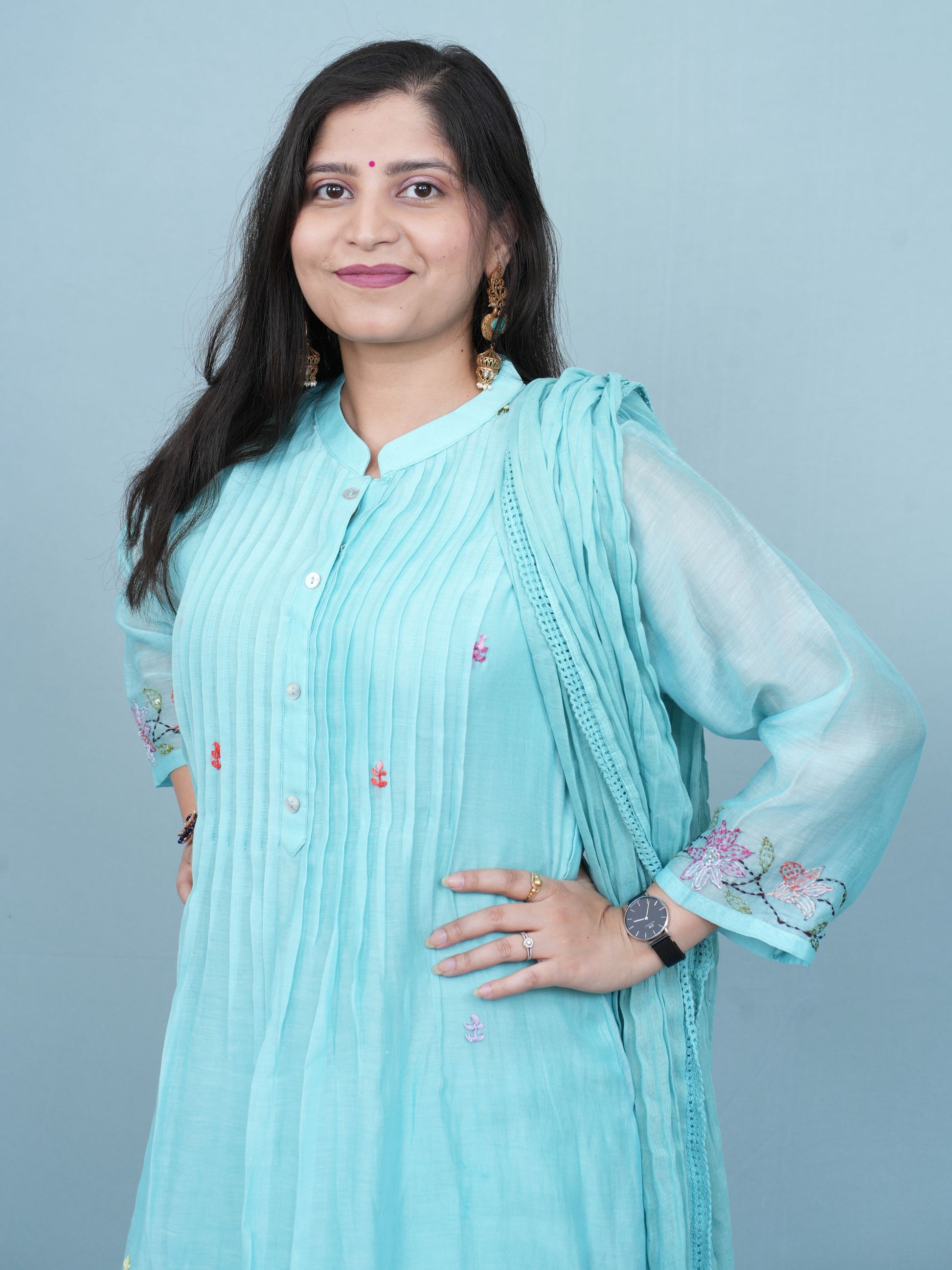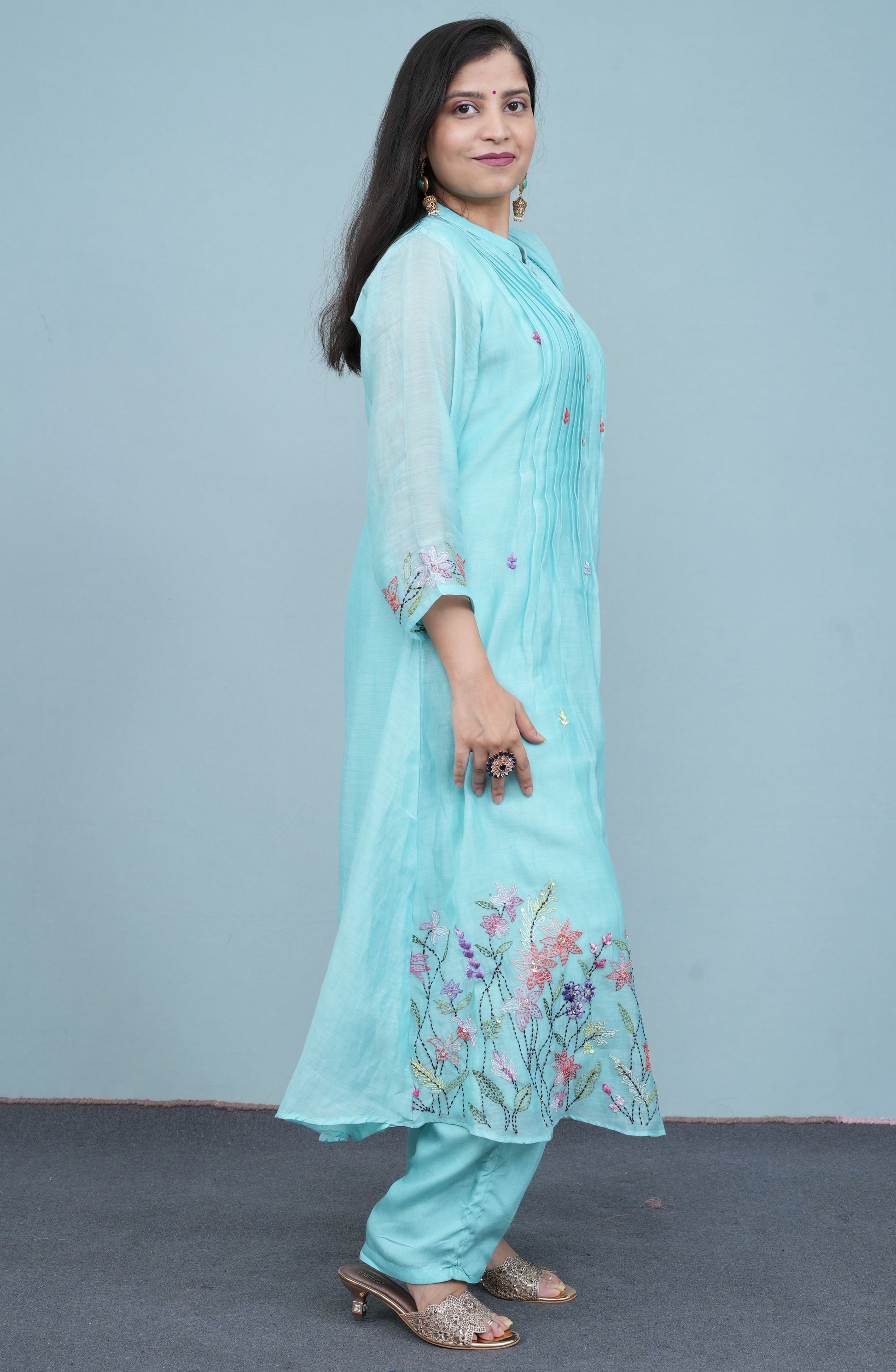 Grace your ethnic collection with this refreshing pastel aqua kurta set, beautifully embellished with delicate floral embroidery. The kurta features fine pleated detailing on the front and exquisite threadwork along the hemline and cuffs in vibrant hues of pink, purple, and green. Made from a soft, breathable fabric, this flowy silhouette comes with matching pants and a dupatta adorned with scalloped lace borders.