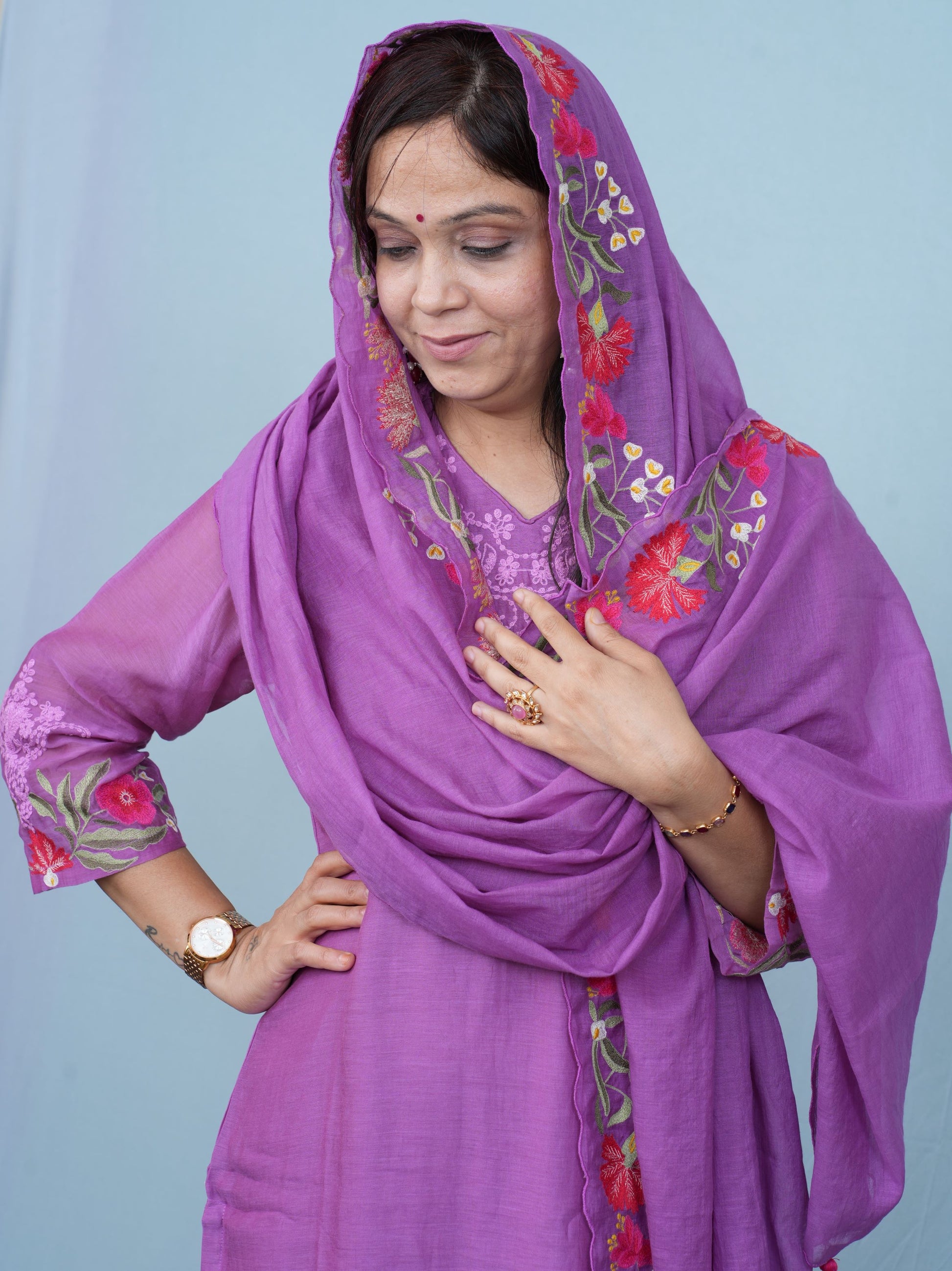 Radiate festive warmth with this elegant purple suit set crafted in a soft silk blend. The kurta features subtle embroidery around the neckline and floral threadwork on the sleeves, blending simplicity with timeless charm.