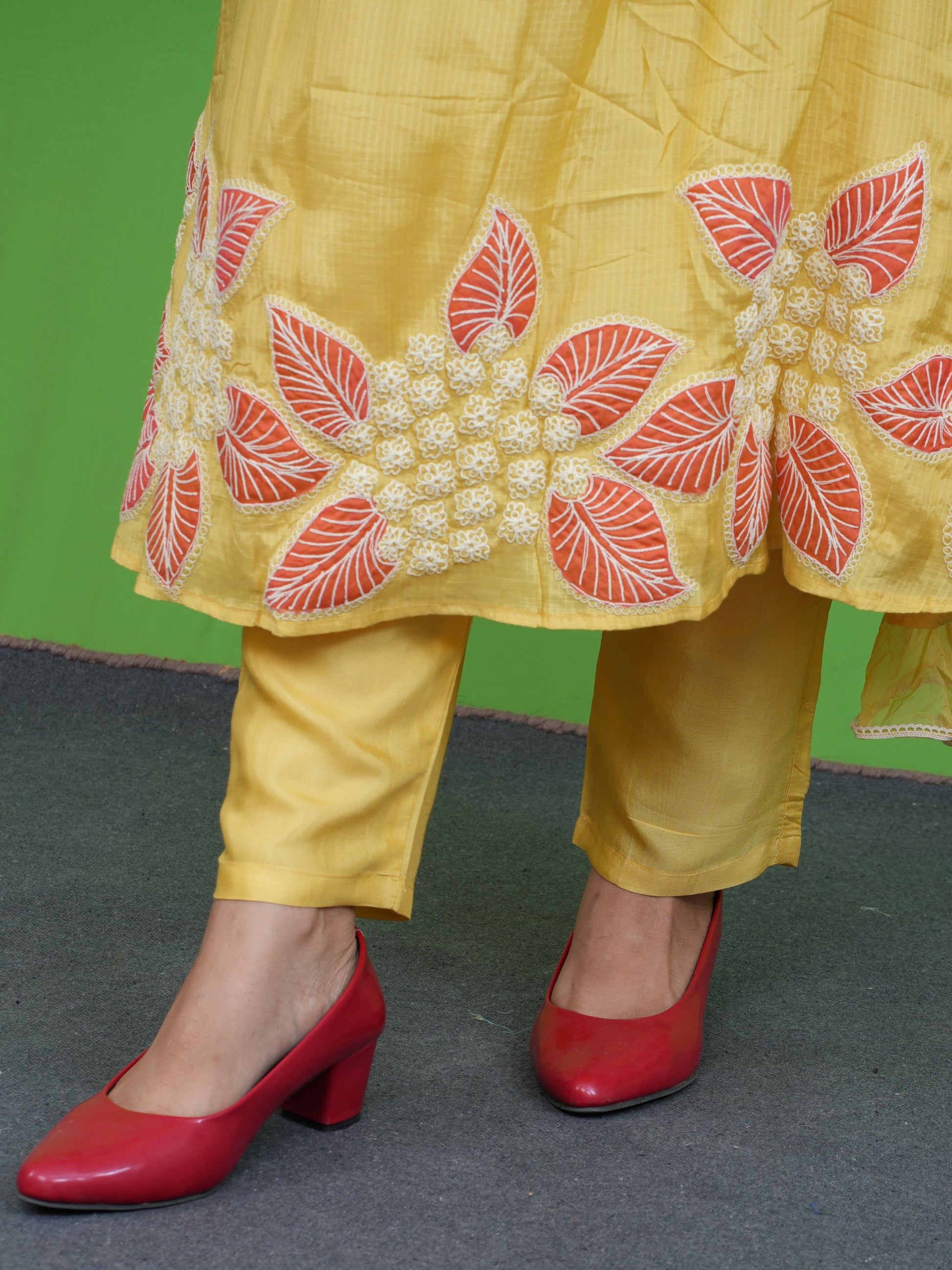 Brighten up any occasion with this radiant sunshine yellow kurta set, designed to keep you stylish and comfortable all day long. The kurta features elegant floral embroidery in white and coral along the hemline and sleeves, adding a playful yet refined touch. Made from a breathable, lightweight fabric, it is paired with matching straight pants and a soft chiffon dupatta. Perfect for festive celebrations, haldi functions, or day events where you want to shine.