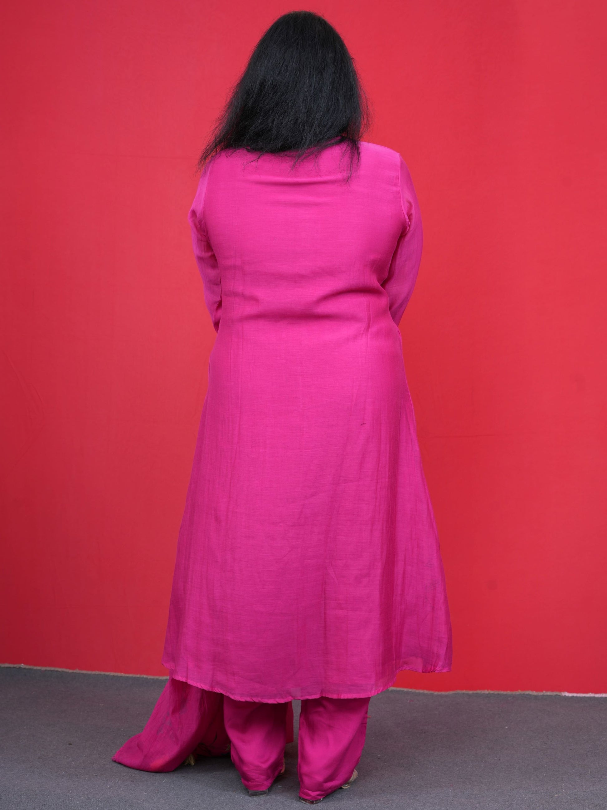 Make a bold and beautiful statement with the Twirl & Tassel Pleated Kurta, a celebration of vibrant elegance and feminine flair. This stunning ensemble features a rich fuchsia cotton kurta adorned with intricate multicolor floral embroidery along the hemline and sleeves, bringing a burst of joy to your ethnic wardrobe.