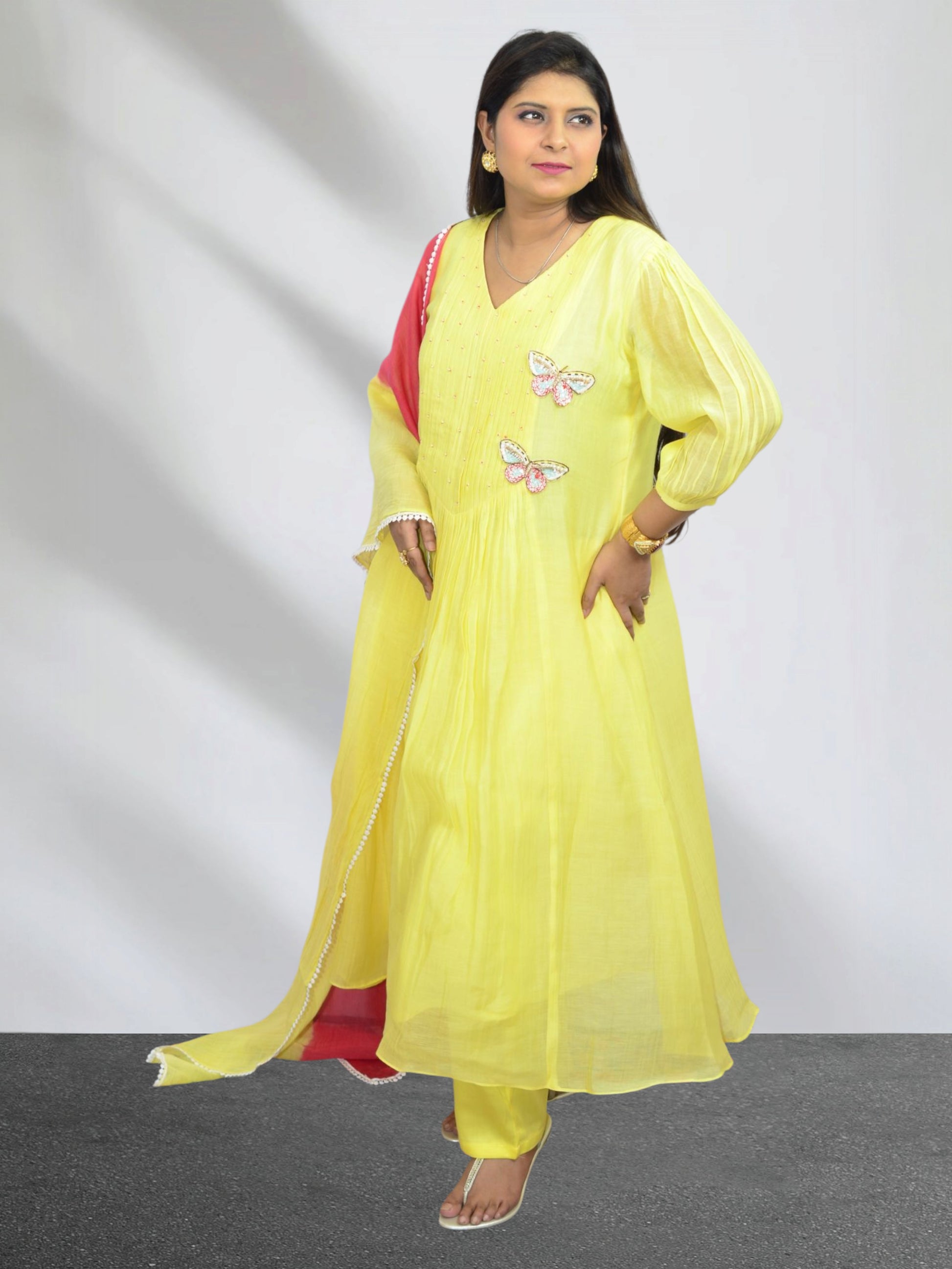 Delicate butterfly embellishments with sequin detailing add a playful yet sophisticated touch to the bodice, making this outfit stand out with subtle glamour. The set is completed with matching churidar bottoms and a contrasting yellow-red dupatta adorned with a dainty lace border, adding a pop of vibrancy.