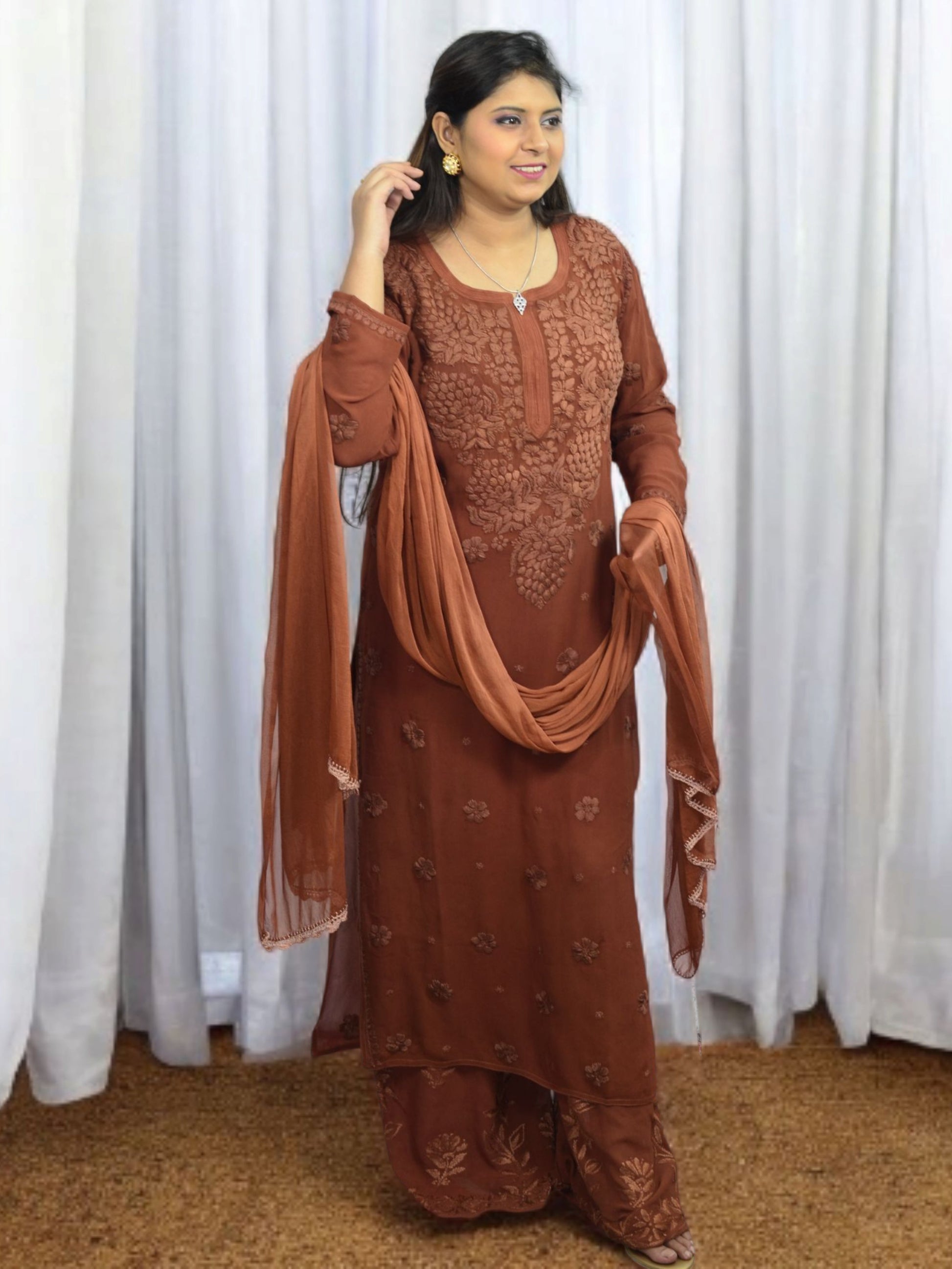 Make an effortless style statement with this Rust Brown Embroidered Suit Set, a perfect blend of earthy elegance and timeless tradition. Crafted in soft georgette-like fabric, the set features rich Chikankari embroidery across the kurta, pant, and dupatta—offering a cohesive, luxurious look.